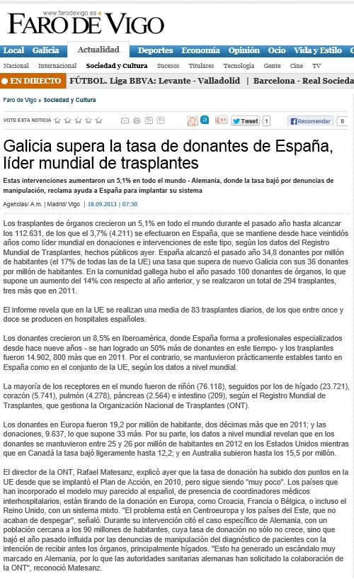 GALICIA SUPERA LA TASA DE DONACION EN ESPAÑA.